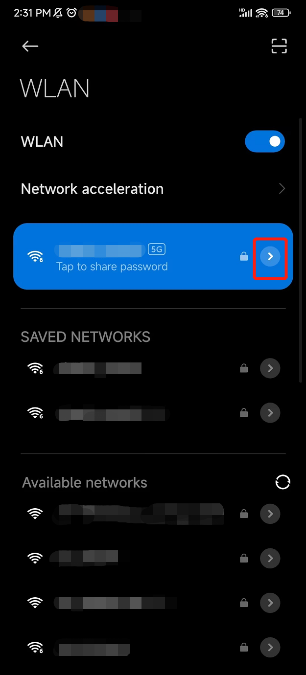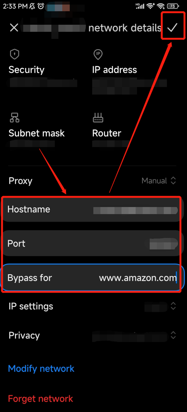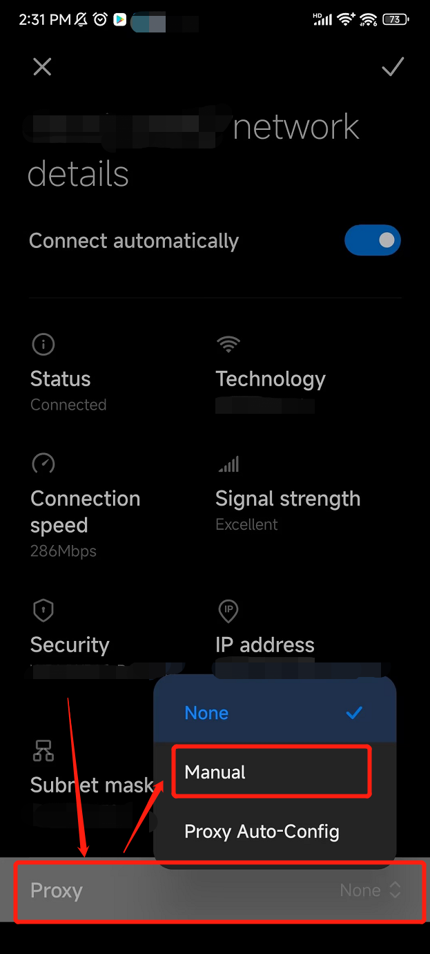 Tap the arrow icon to view the details of the connected Wi-Fi. Then, scroll down to the Proxy section and switch the status to Manual.
