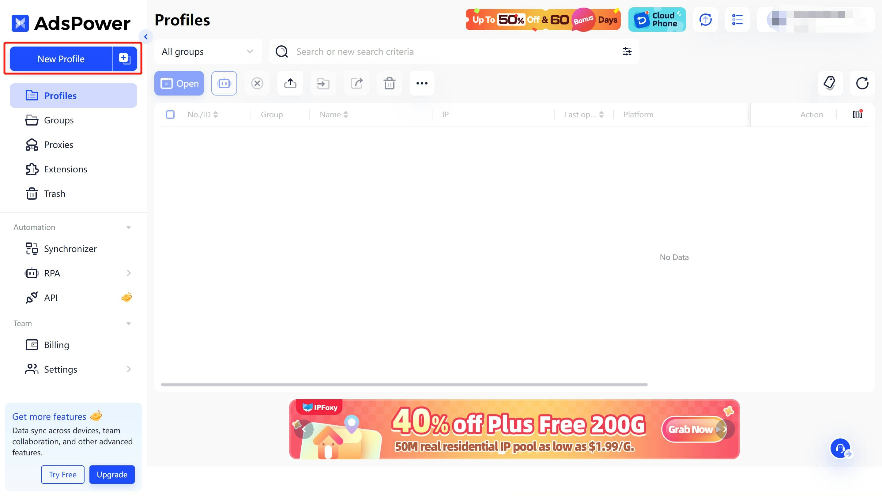 Find and click the New Profile button located in the upper left corner of the Adspower interface.