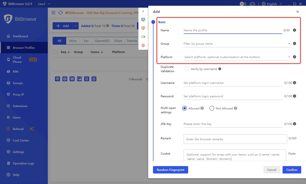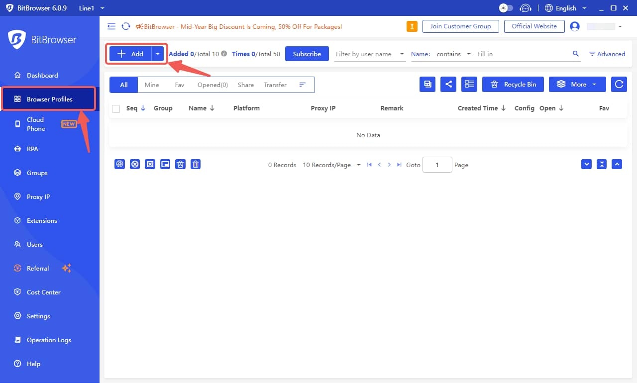 Within the BitBrowser interface, locate the Browser Profiles section and click the Add.