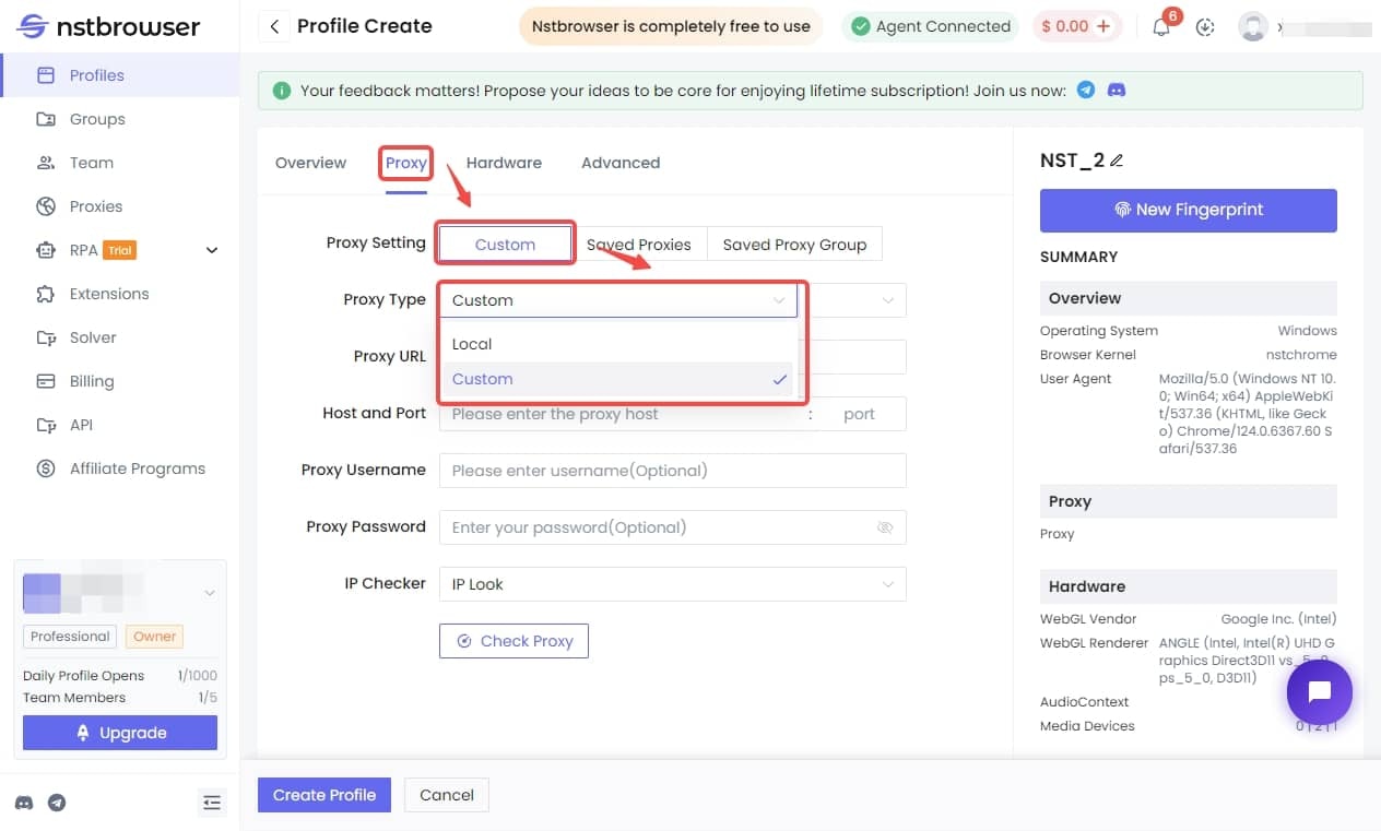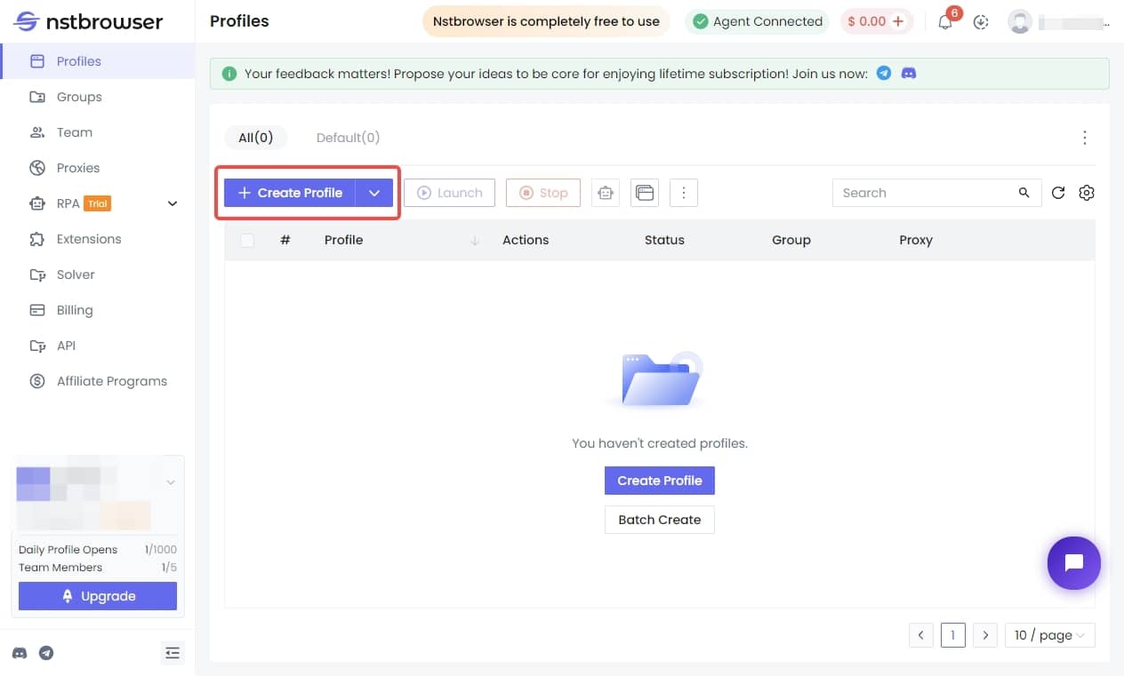 Within the NstBrowser interface, locate the Profiles section and click Create Profile.